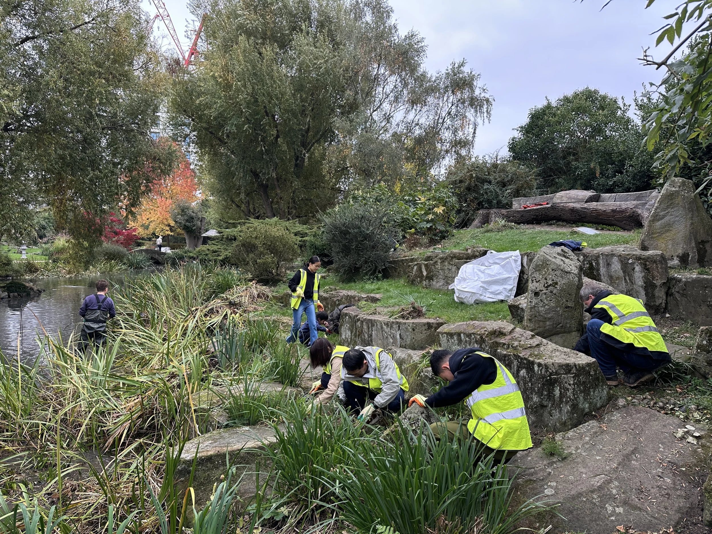 Alongside volunteers from the Nippon Club, Japan Society and Friends of the Japanese Garden of Peace, Takashi and Andrew supported by weeding and pruning at the garden in Hammersmith Park, established in 1910 for the Japan-Britain Exhibition. The gloomy weather was not enough to dampen spirits, aided in part by delicious bento lunches from Mugen. The day concluded with speeches from staff of the Embassy of Japan and Hammersmith and Fulham Council to congratulate the team.